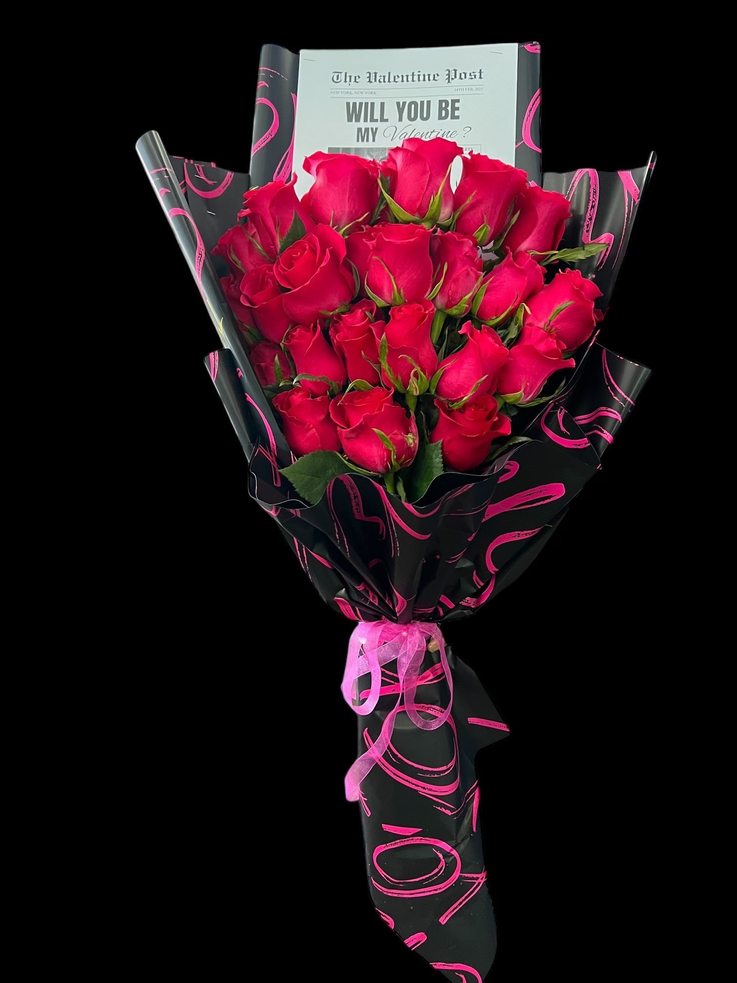 Make Valentines Day unforgettable with this heart-shaped bouquet of vibrant red roses, wrapped in elegant pink and accented with a delicate ribbon and sparkling embellishment. Complete with a Happy Valentines Day banner, this arrangement is a perfect symbol of love and devotion.