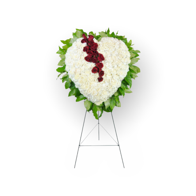 How do you mend a broken heart? Show them the love and compassion you feel with this broken heart standing spray. Stunning red roses and white carnations perfectly express your sympathy and the words you cannot say.