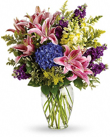 Put your words of caring into flowers with this beautiful array of pink lilies, blue hydrangea and other floral favorites