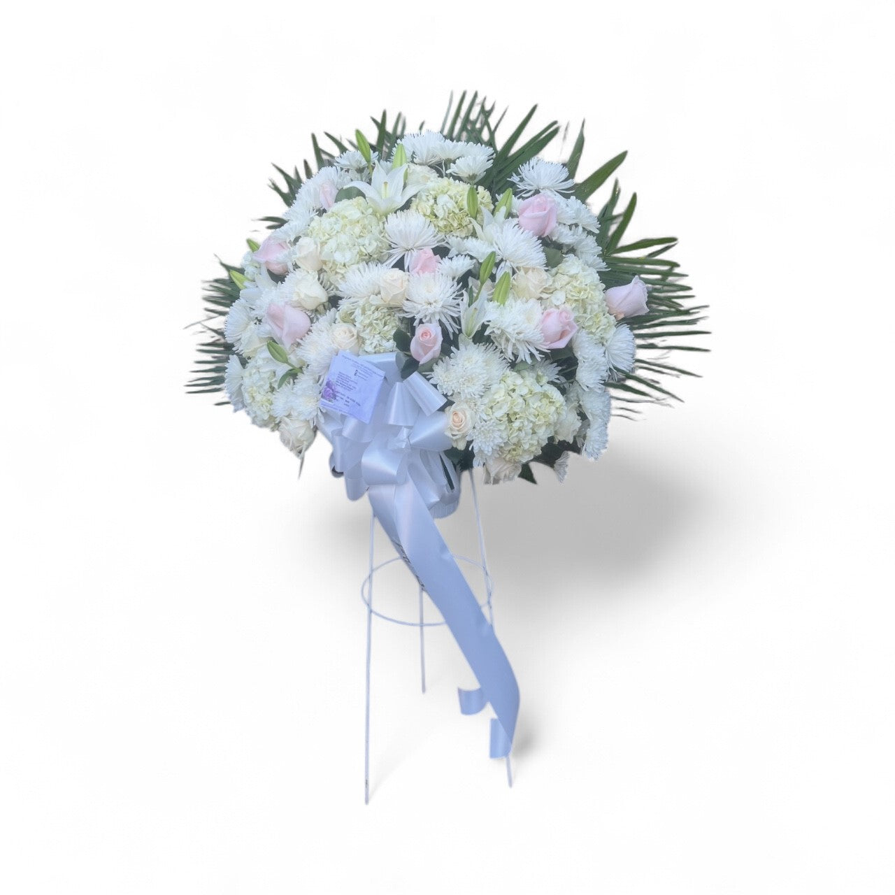 This arrangement features a radiant mix of yellow spider mums, lavender stock, pink roses, and touches of green hydrangea, creating a cheerful yet elegant tribute. Finished with a coordinating bow and displayed on a sturdy easel, it’s a thoughtful way to honor a loved one and uplift the hearts of those gathered.