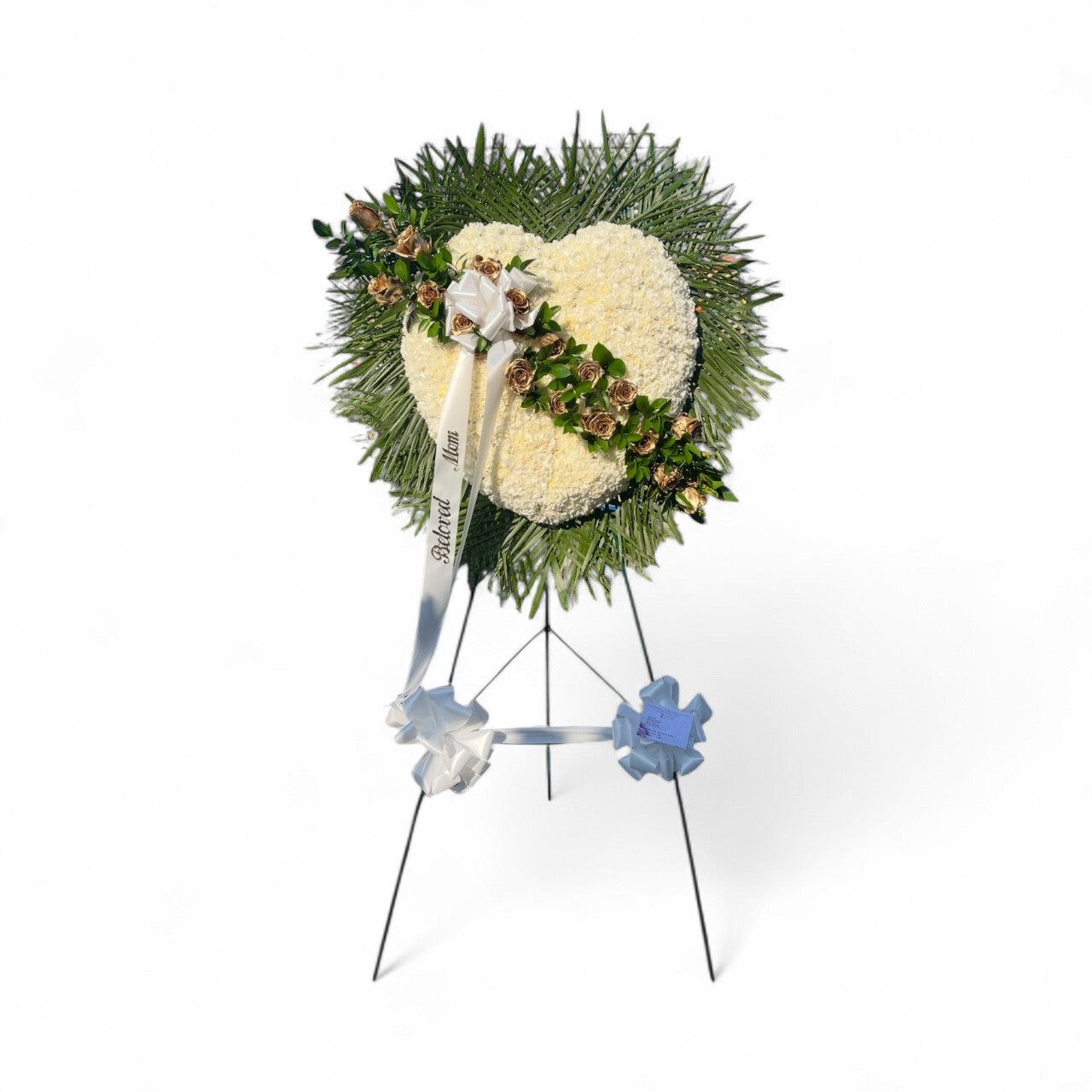 An elegant heart-shaped tribute crafted with white blooms and gold accents, symbolizing purity, love, and everlasting remembrance